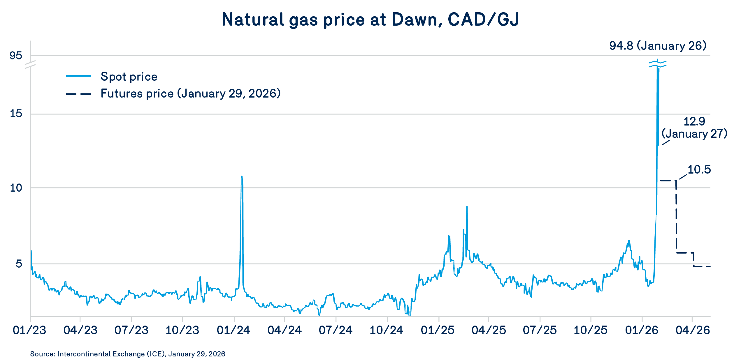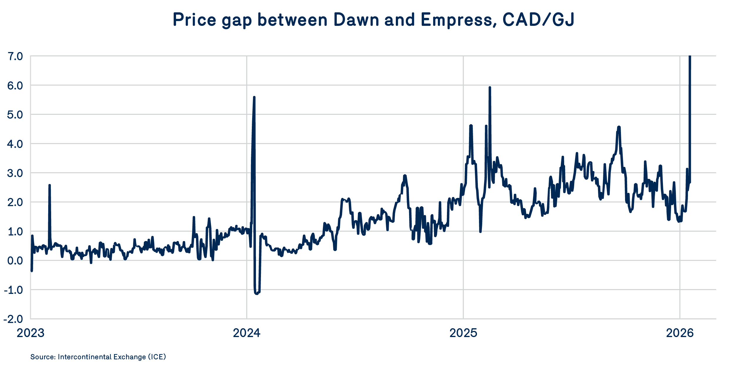 In contrast, prices at Empress remained much more moderate. Although a brief peak of $27/GJ was observed on January 26, the market quickly returned to its usual levels of around $3.33/GJ on January 28.