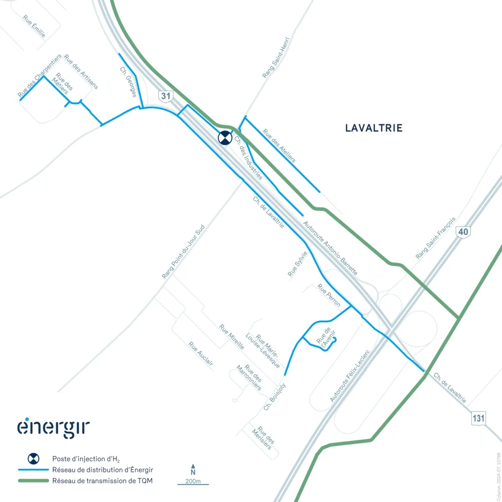 Le réseau d’Énergir à Lavaltrie a été sélectionné pour la quatrième phase du projet d’injection d’hydrogène, qui vise à démontrer la faisabilité technique de mélanger une faible proportion (5 %) d’hydrogène avec le gaz naturel qui y circule. Le début de l’injection d’hydrogène dans ce réseau est prévu pour le début 2026