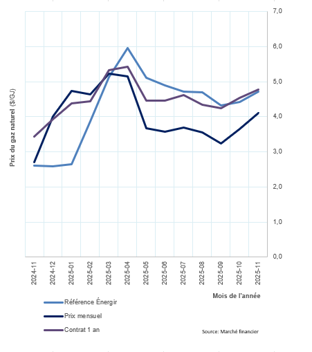Le prix de fourniture du GNR distribué par Énergir varie annuellement selon les ententes contractuelles avec les fournisseurs de GNR. Le prix annuel du GNR vendu à nos clients est donc établi en fonction de la moyenne du prix prévu dans ces contrats et est fixé annuellement dans le cadre de la cause tarifaire déposée chaque année à la Régie de l’énergie.