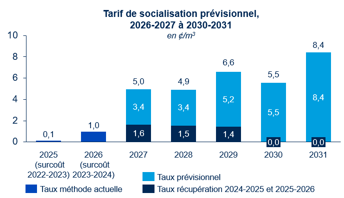 Les frais de socialisation GSR s’élèvent à 0,960 ¢/m³ pour la Cause tarifaire 2025-2026. Les frais de socialisation devraient représenter moins de 2,1 % de la facture totale d’un client moyen.