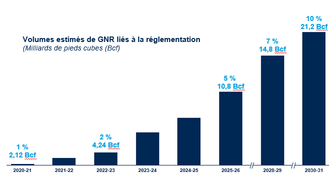 Énergir doit se conformer aux obligations réglementaires prévues par le gouvernement du Québec, qui oblige les distributeurs gaziers, à avoir au moins 2 % de GSR dans leur réseau pour 2023-2024, puis 5 % de GNR en 2025-2026, et 10 % pour 2030-2031.