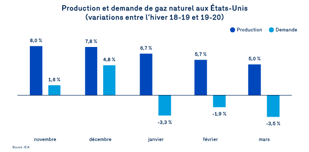 Au cours des mois d’hiver 2019-2020, la production de gaz naturel s’est accrue en moyenne de 6,6 % par rapport à l’hiver 2018-2019. Durant la même période, la demande de gaz naturel enregistrait des augmentations plus faibles en novembre et décembre, pour finalement faire place à des diminutions à partir du mois de janvier.