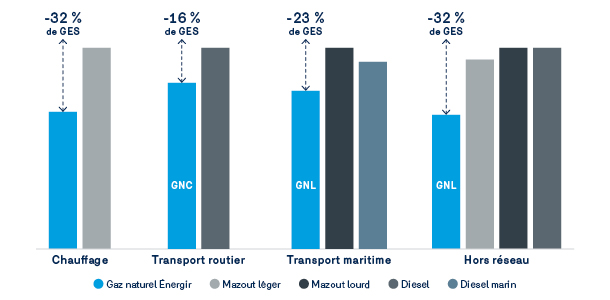 - Pour les autres usages du gaz naturel ainsi que pour le GNL utilisé hors réseau, les émissions de GES du gaz naturel sont de 16 % à 32 % moins élevées que pour les produits pétroliers. (voir graphique à gauche)
