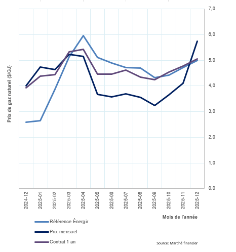 Le prix de fourniture du GNR distribué par Énergir varie annuellement selon les ententes contractuelles avec les fournisseurs de GNR. Le prix annuel du GNR vendu à nos clients est donc établi en fonction de la moyenne du prix prévu dans ces contrats et est fixé annuellement dans le cadre de la cause tarifaire déposée chaque année à la Régie de l’énergie.