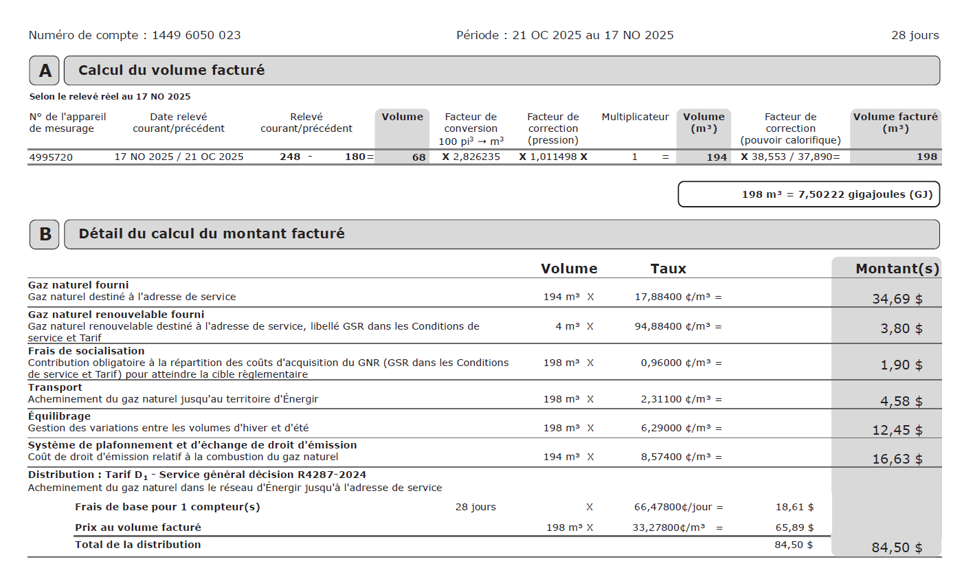 Vos volumes de GNR achetés sont indiqués sur vos factures détaillées de consommation totale de gaz naturel.
