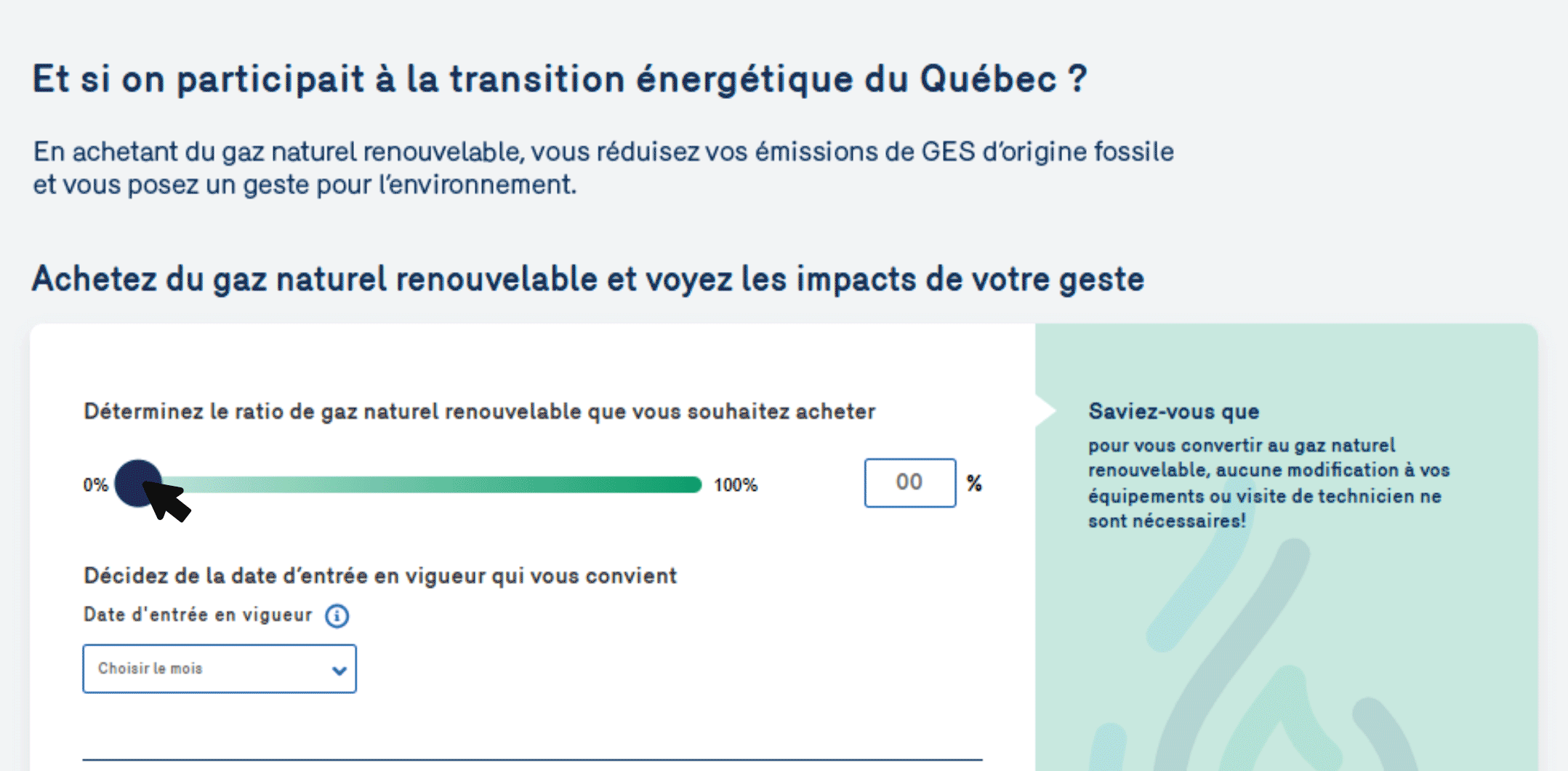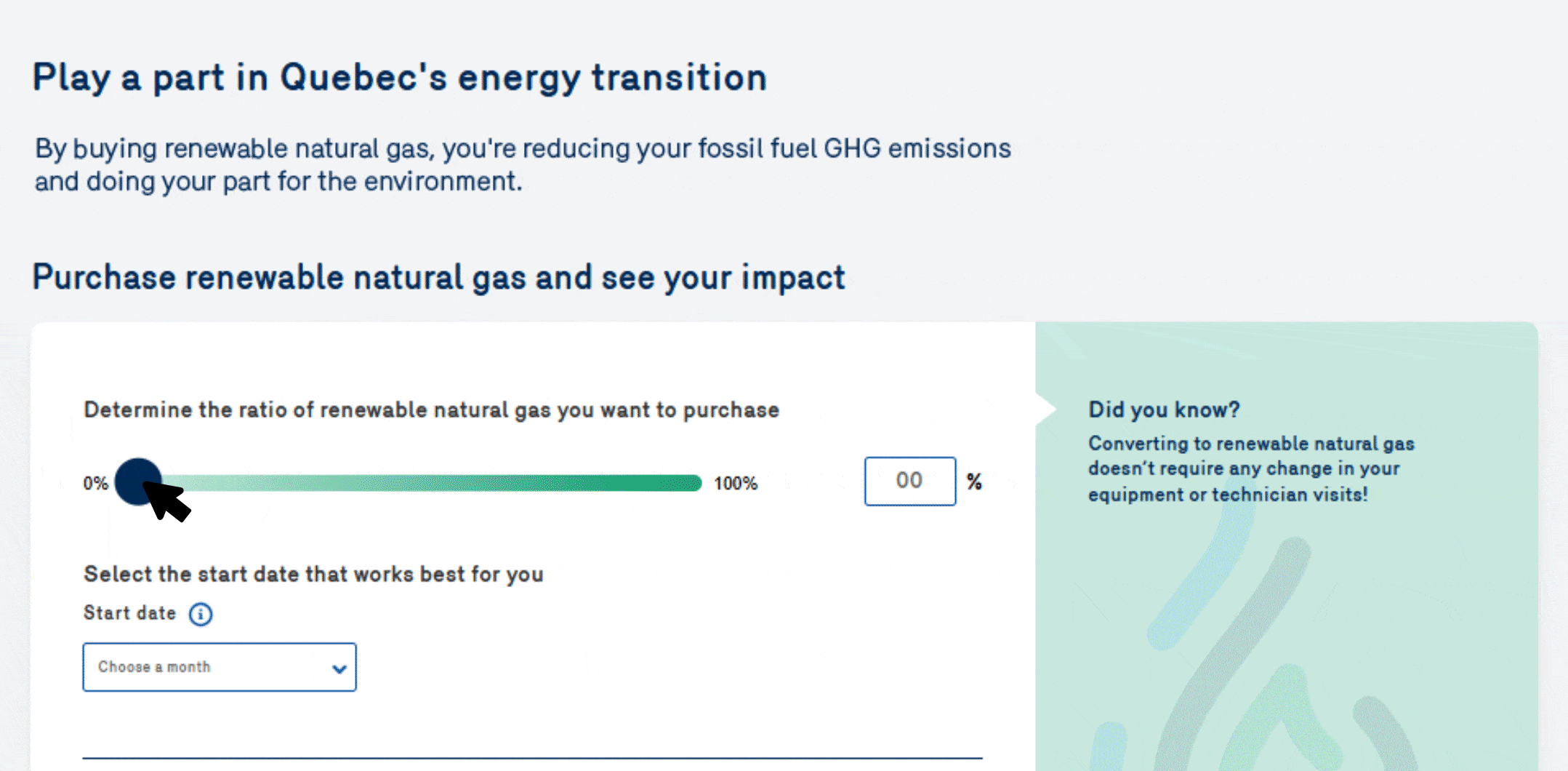 Vous pouvez demander une modification de votre achat de gaz naturel renouvelable en tout temps. En tant que client.e, pour une entrée en vigueur le 1er jour du mois suivant, vous devez soumettre votre demande au plus tard le 20e jour du mois courant. Les demandes reçues après le 20e jour du mois seront traitées avec les demandes du mois suivant. La demande de changement se fait directement dans l’Espace client en précisant le pourcentage d'achat révisé et la date d’entrée en vigueur souhaitée.