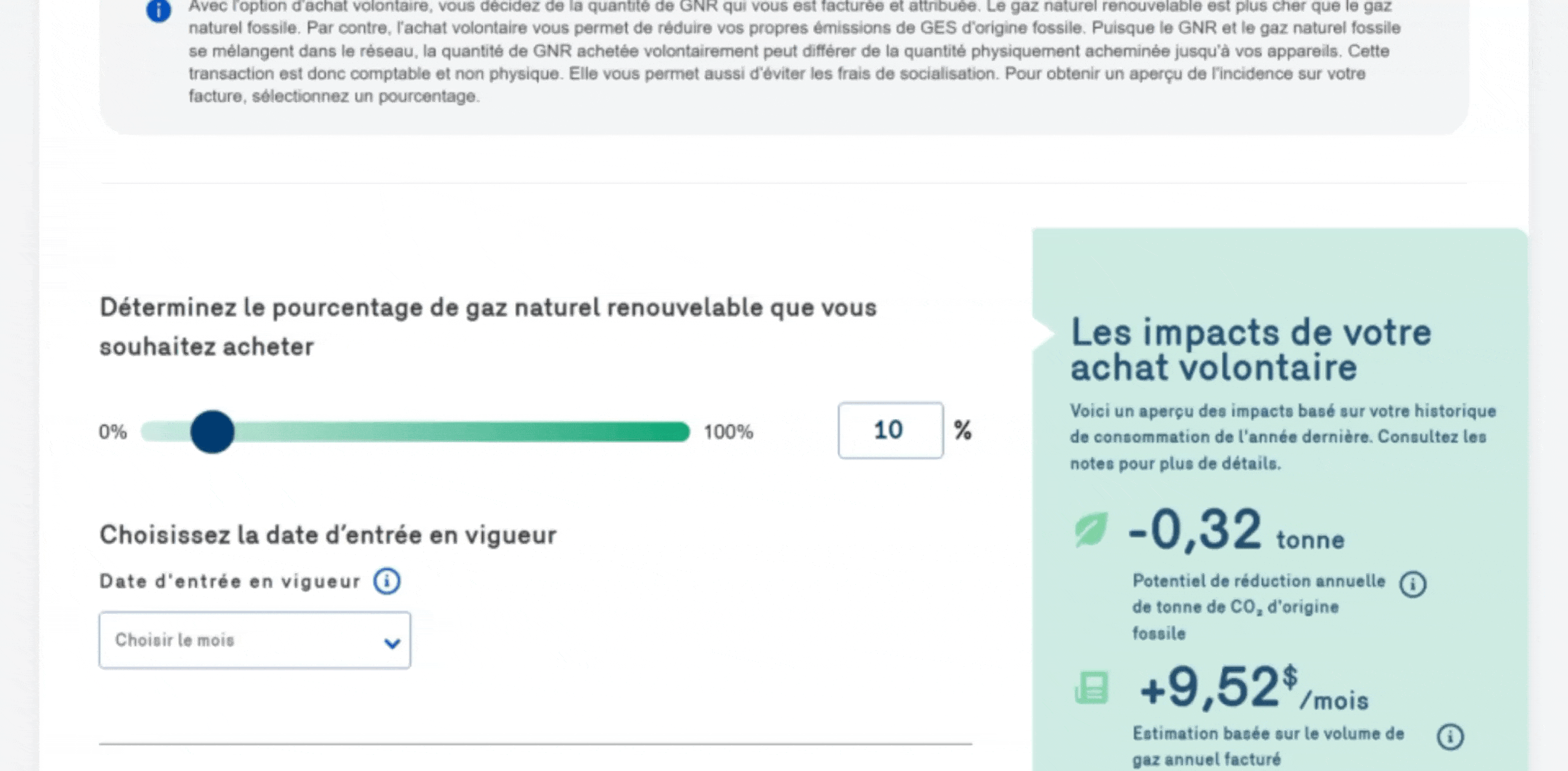 Déterminez le pourcentage de gaz naturel renouvelable que vous souhaitez acheter et choisissez la date d’entrée en vigueur.